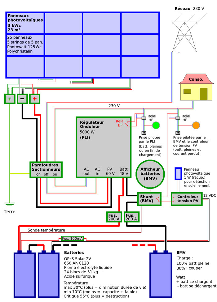 Notre installation de production d’électricité est un système photovoltaïque non connecté au réseau, donc avec un stockage d’électricité : une affreuse batterie avec du plomb et de l’acide sulfurique (même technologie que les batteries de démarrage de voiture).