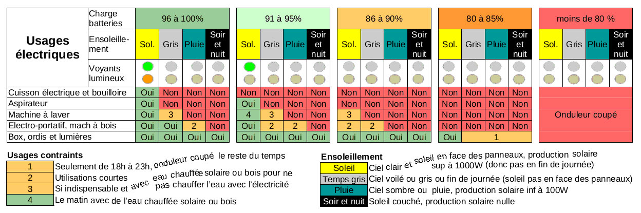 - L’aspirateur et la cuisson électrique sont sensés attendre le voyant orange (batterie pleine et courant perdu).